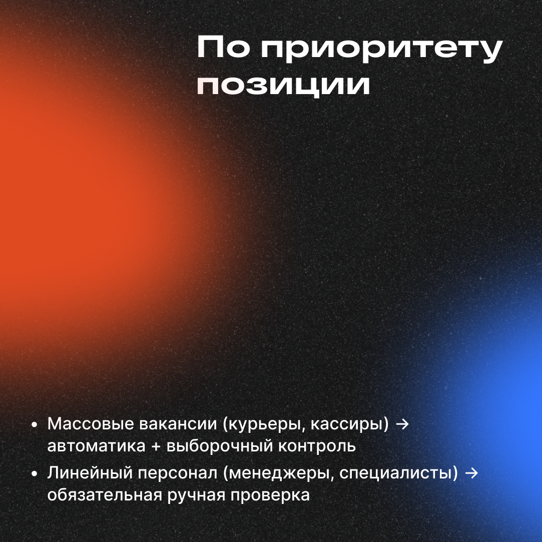 - Автоматические фильтры отсекают нецелевые отклики (не тот город, возраст, опыт, отсутствие квалификационных документов)