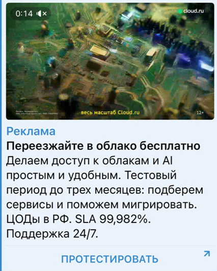 Пример рекламного объявления Telegram Ads