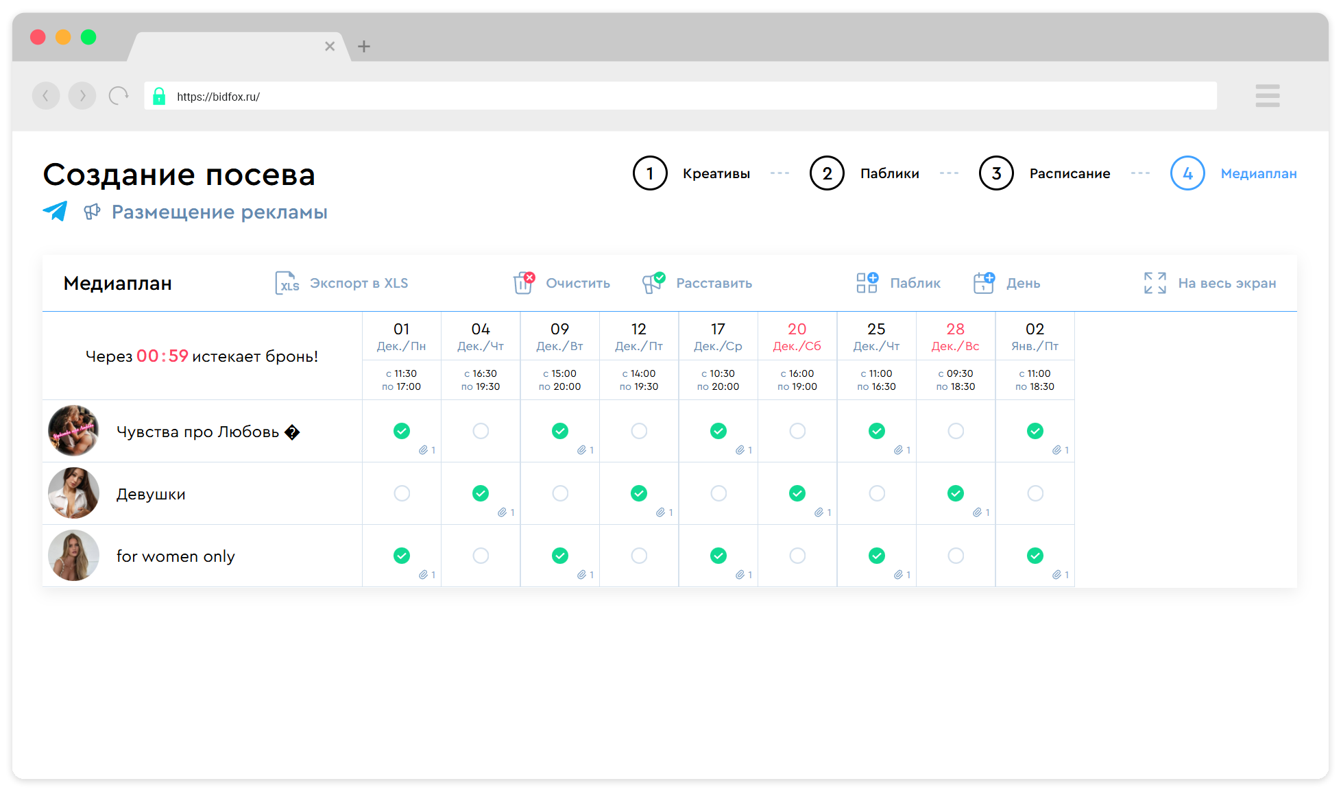 Составьте стратегию публикаций: какие креативы, на каких каналах и в какие дни.