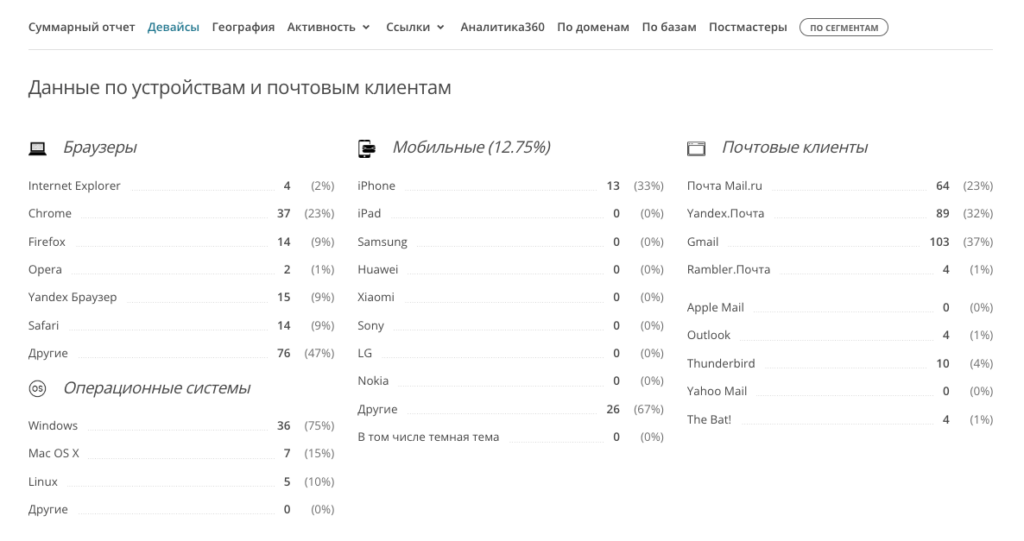 - Устройства: узнайте, с каких устройств заходят чаще (ПК или мобильные). Это важно для адаптации верстки писем.