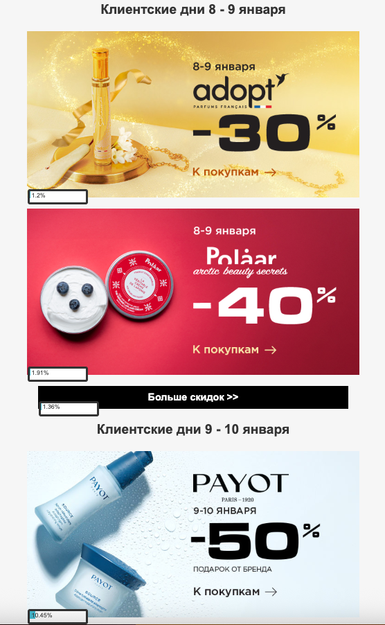 - Карта кликов: Какие ссылки и кнопки в письмах самые популярные? Если в рассылке интернет-магазина одежды большинство кликает на какие-то определенные товары или бренд, это жирный намек на портрет вашей аудитории.