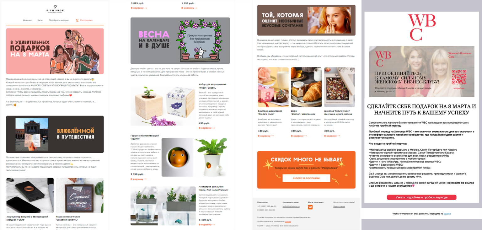 Одно письмо к 8 марта — это попытка попасть в уже перегруженный inbox. Гораздо эффективнее — серия писем с разной задачей.