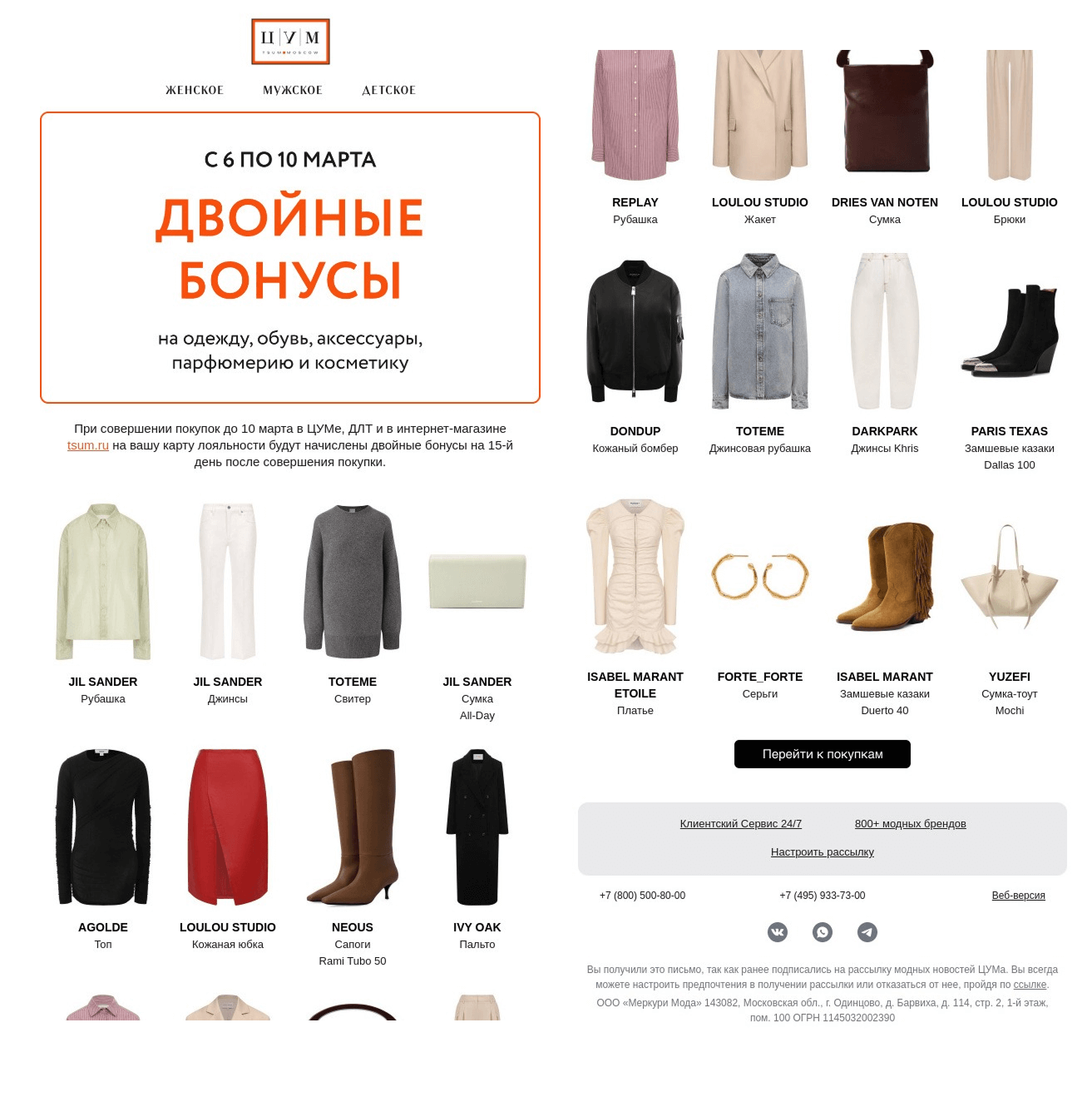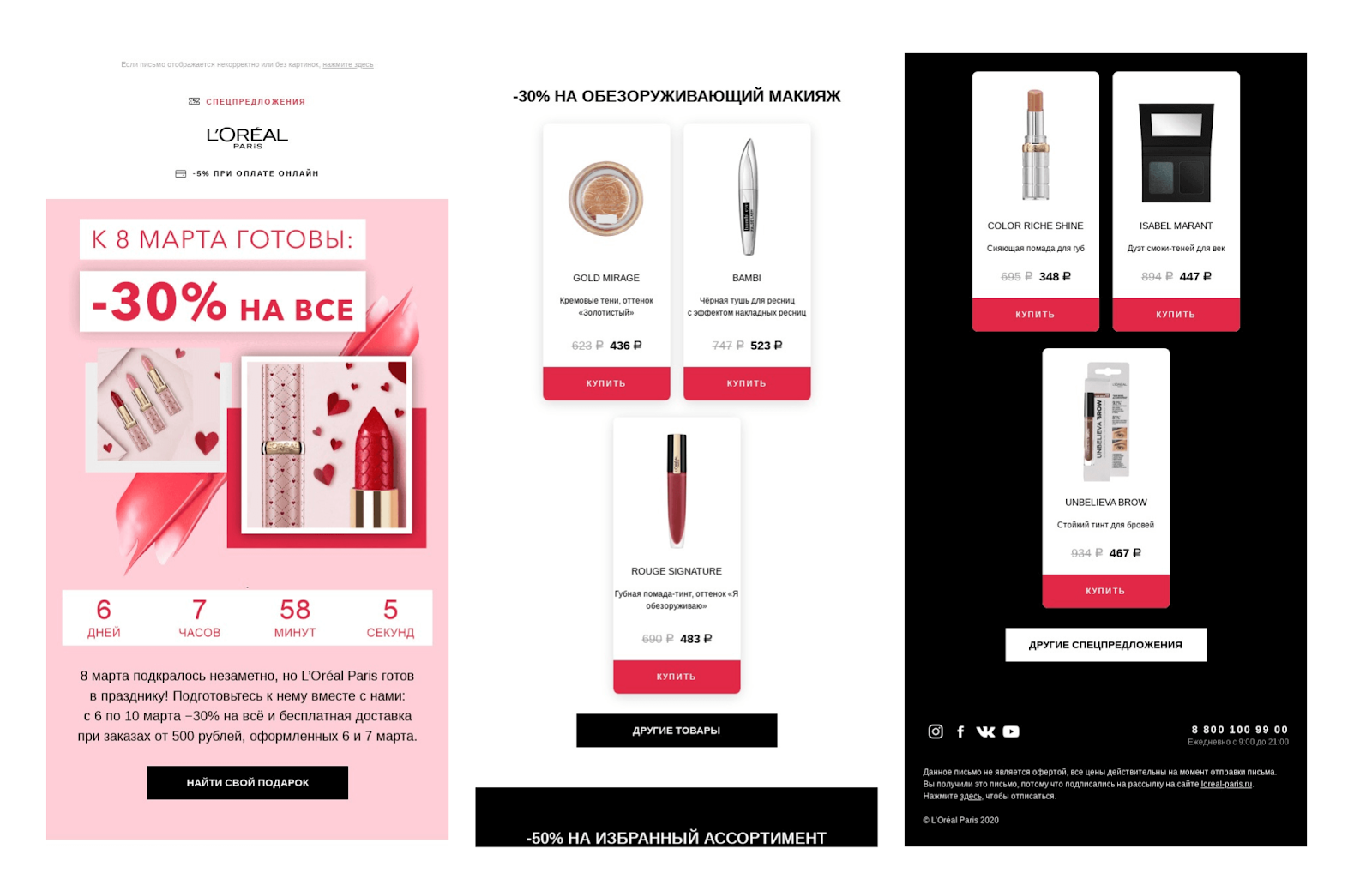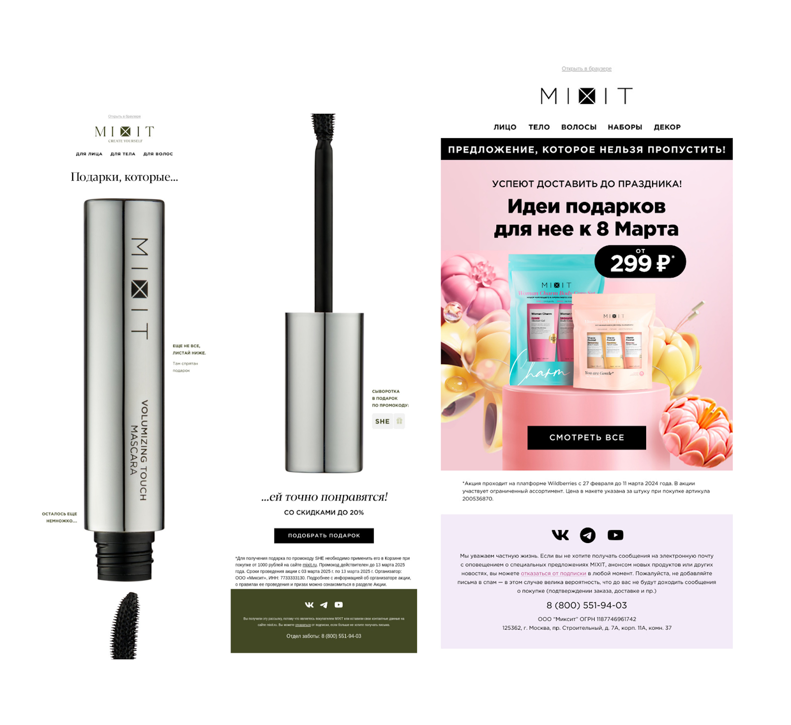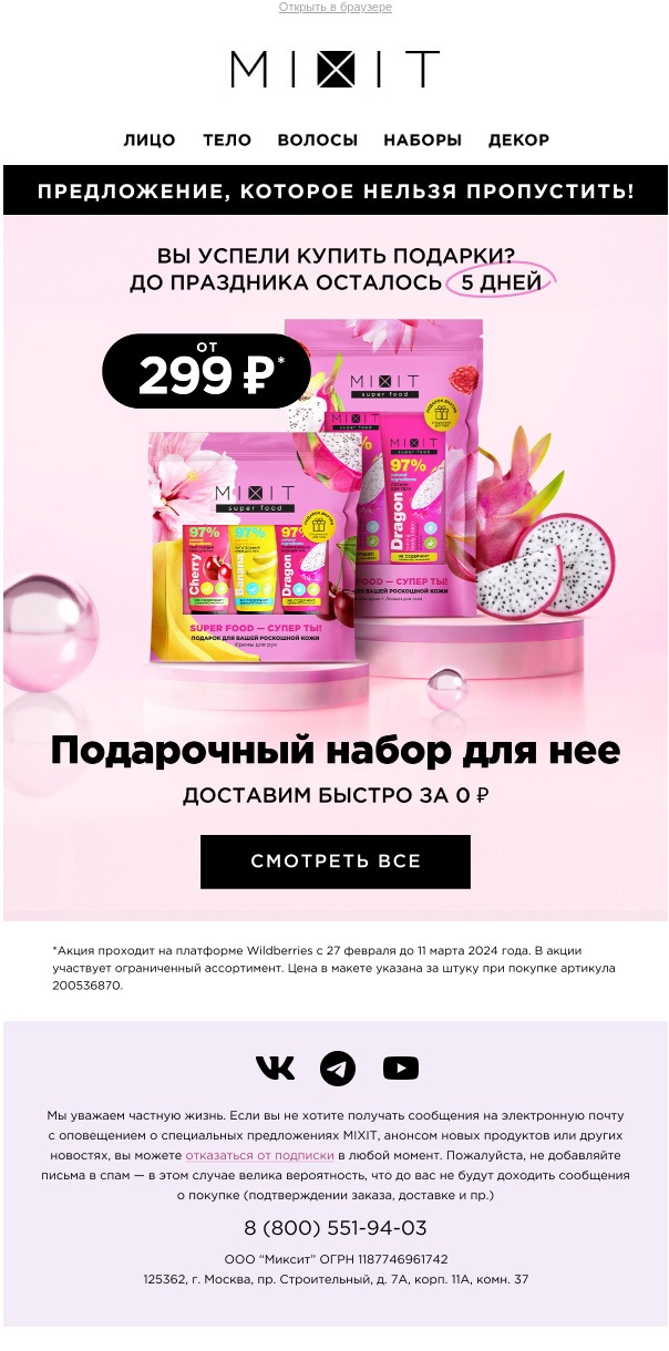 За 3–5 дней до 8 марта. Цель — усилить интерес. В письмо можно добавить новую коллекцию, персональные рекомендации или просто сделать напоминание о хите продаж.