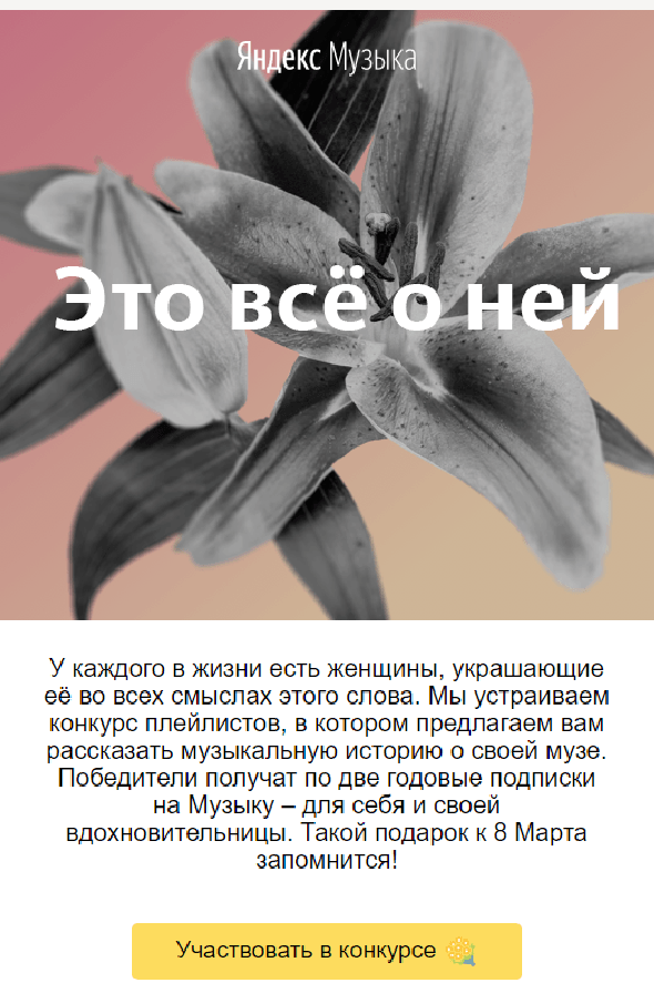 Например, Яндекс Музыка запускала конкурс по созданию плейлистов «Для неё». Это одновременно вовлекает, генерирует пользовательский контент и создает вирусный эффект.