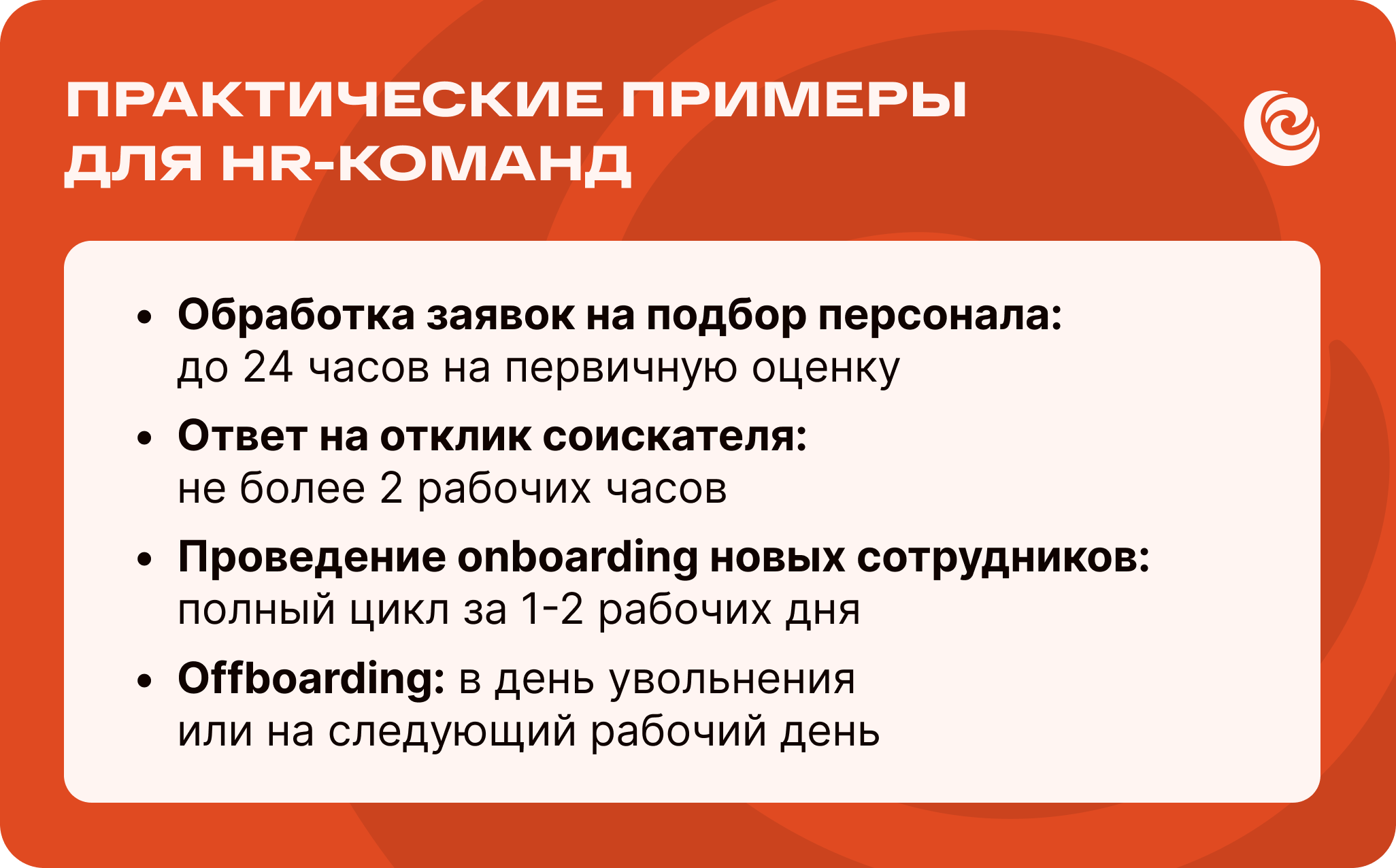 Стандарты обслуживания (например, гарантированные сроки ответа кандидату) становятся инструментом, который гарантирует соблюдение временных рамок по всем критичным процессам. В отличие от размытых обещаний сделаем как можно быстрее, чёткие временные стандарты создают предсказуемость для бизнеса.
