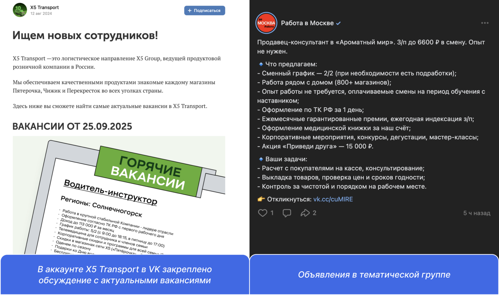 Социальные сети. Размещайте объявления о работе в тематических сообществах о поиске работы, например в группах с предложениями вакансий для конкретного города. Если у компании есть собственные аккаунты в соцсетях, стоит опубликовать объявление и там.
