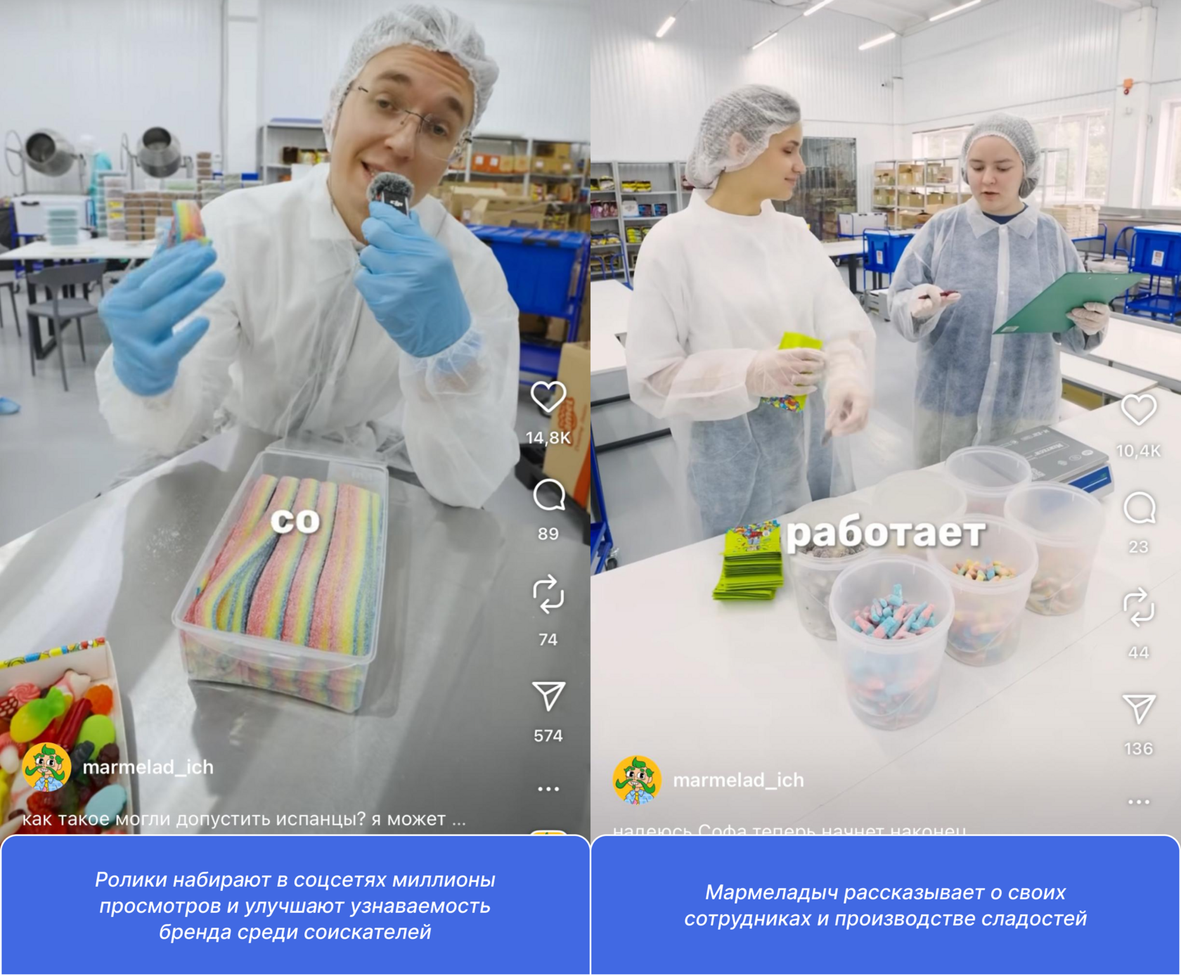 Креативные спецпроекты с инфлюенсерами. Этот инструмент открывает массу возможностей. Можно реализовать идею «День из жизни в компании», где блогер показывает закулисье и рабочую атмосферу в формате сторис или влога. Например, как бренд мармелада «Мармеладыч» рассказывает в социальных сетях о работе фасовщиц. Еще одна идея — серия коротких видео, в которых инфлюенсер сообщает о процессе найма в компанию.