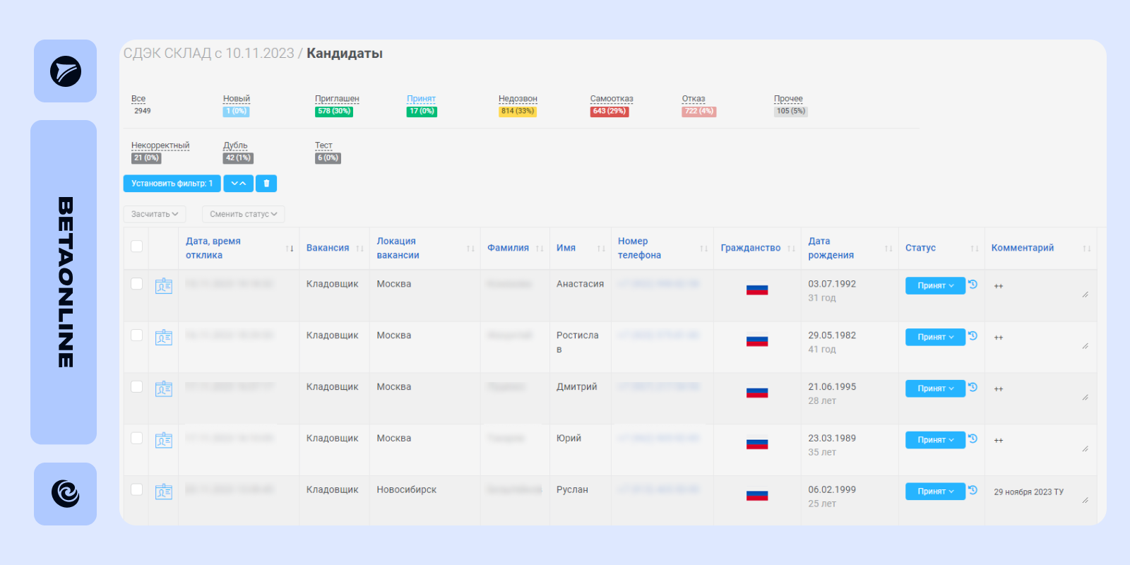 Рекрутеру не обязательно сразу связываться со всеми кандидатами. Этап фильтрации откликов можно автоматизировать. Решение BetaOnline помогает отсортировать отклики по заданным критериям и выгружать релевантных соискателей в готовые реестры для разных сорсеров и руководителей. Кандидаты вне возрастного диапазона, из неподходящих регионов и без необходимых документов, таких как медкнижка или права, будут отсеяны и не займут драгоценные человеко-часы. HR-команда сразу получает пул заинтересованных соискателей, с которыми можно обсуждать детали вакансии.