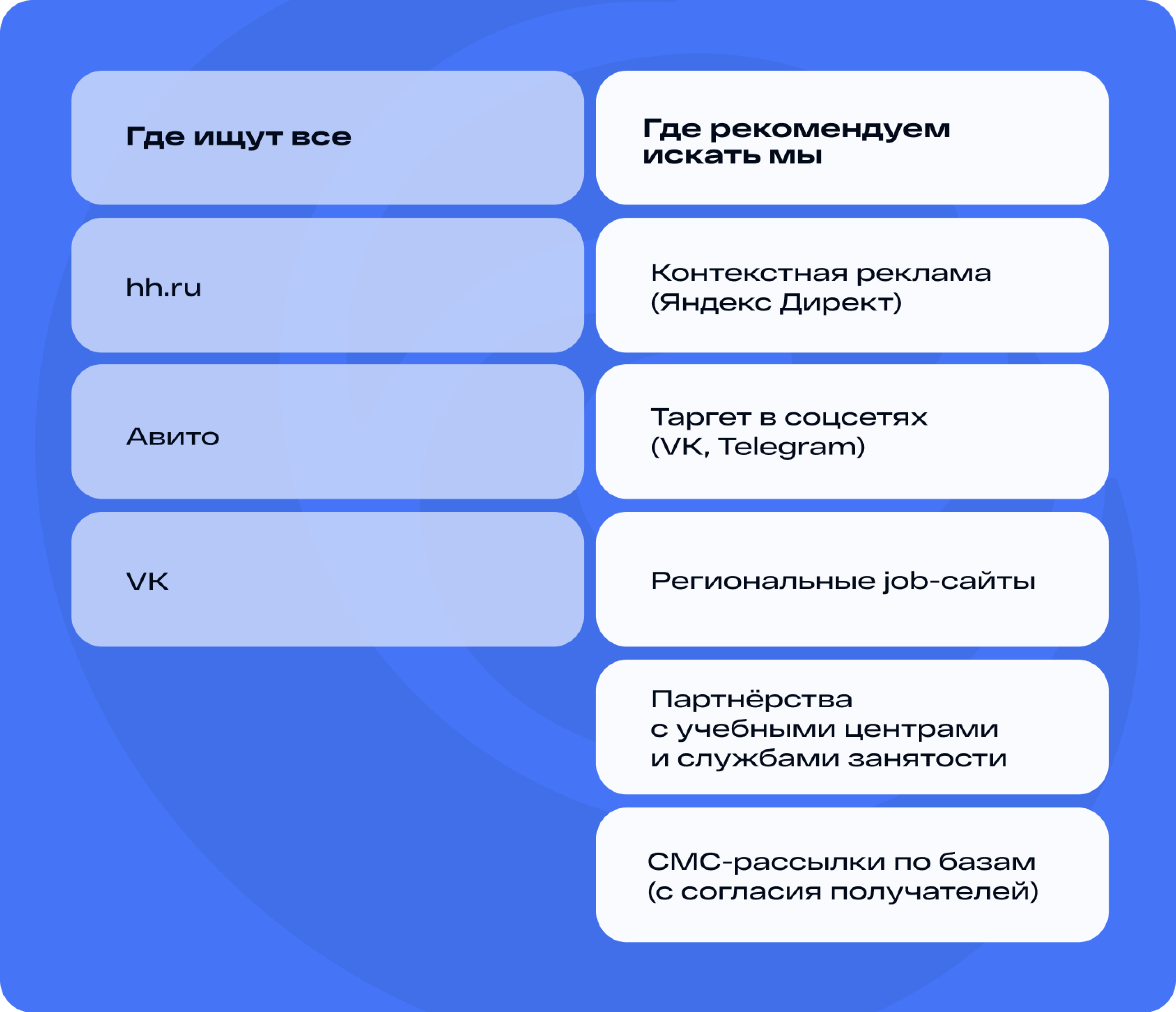 Закупка баз для рассылок у операторов связи. Такой канал позволяет отправлять информацию о вакансиях через СМС или мессенджеры релевантной аудитории. Например, можно сообщить жителям Ростова и Ростовской области в возрасте от 35 до 45 лет о том, что идет поиск фасовщиков на производство.