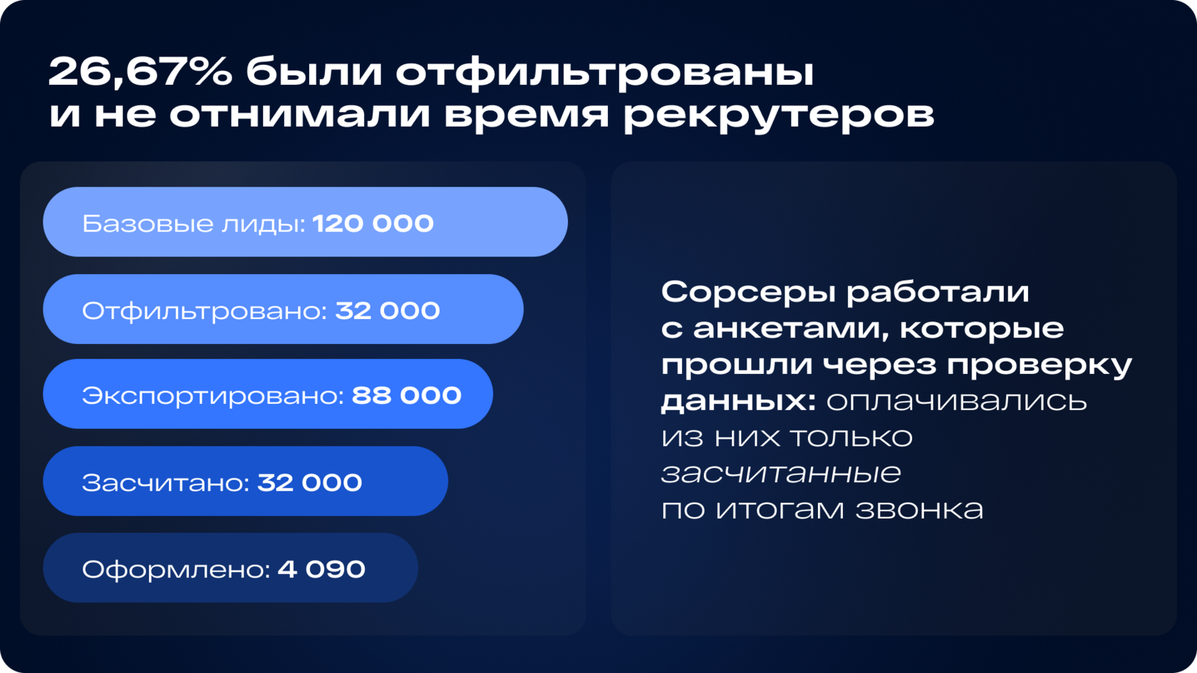 - Контролирует целевые показатели с точностью до одного подтвержденного кандидата в каждом городе.
