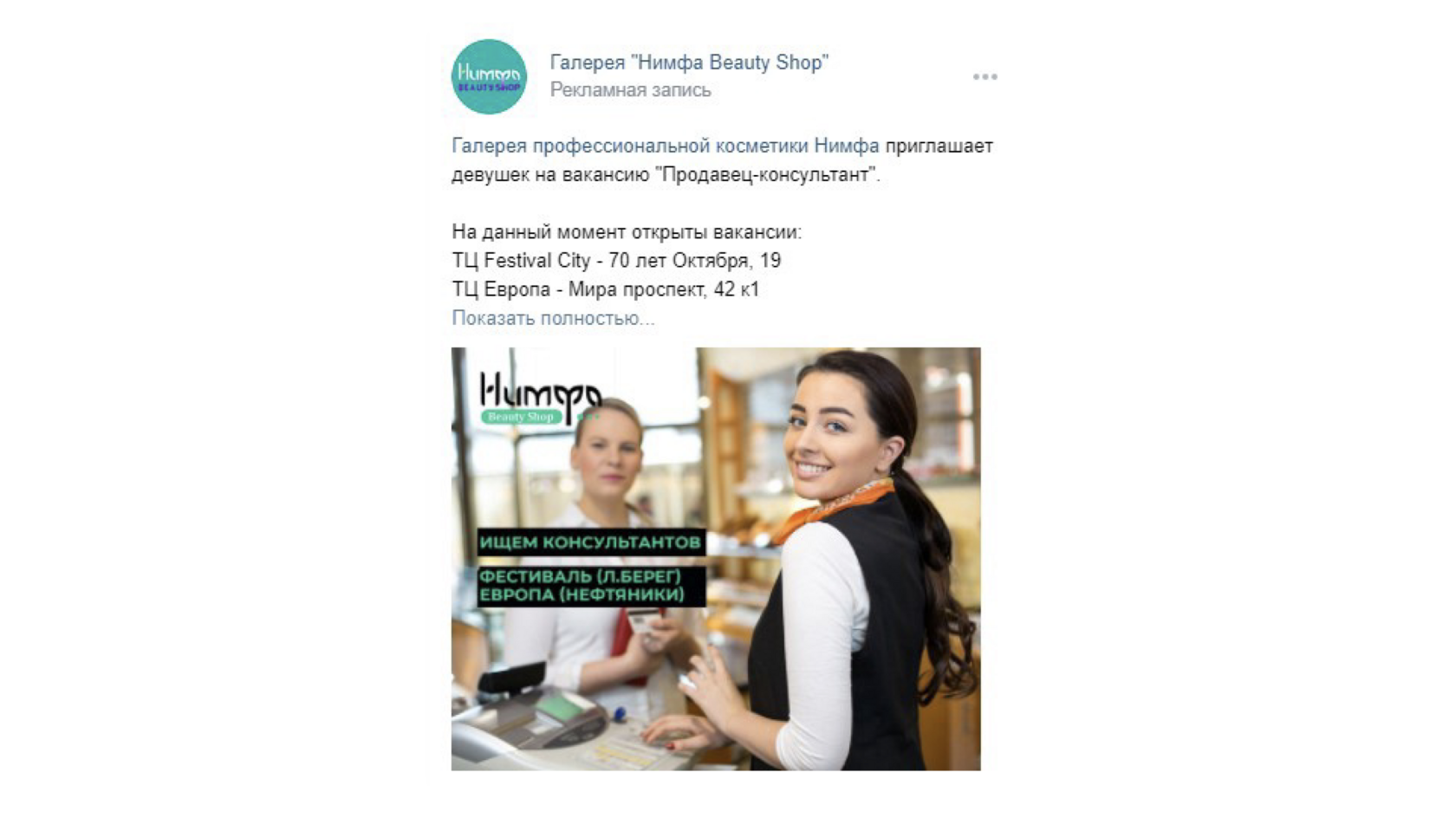 Когда готовите текст вакансии, помните: чем больше конкретики в объявлении, тем более подходящие соискатели на нее откликнутся. Разберем на примере вакансии для продавца-консультанта в продуктовый магазин: