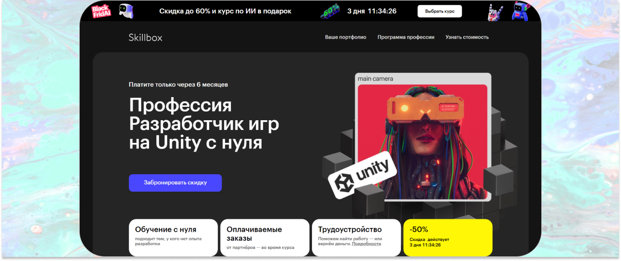 - «Профессия “Разработчик игр на Unity с нуля”» от Skillbox: оплатить курс можно через шесть месяцев после начала обучения, а после его завершения помогут найти работу.