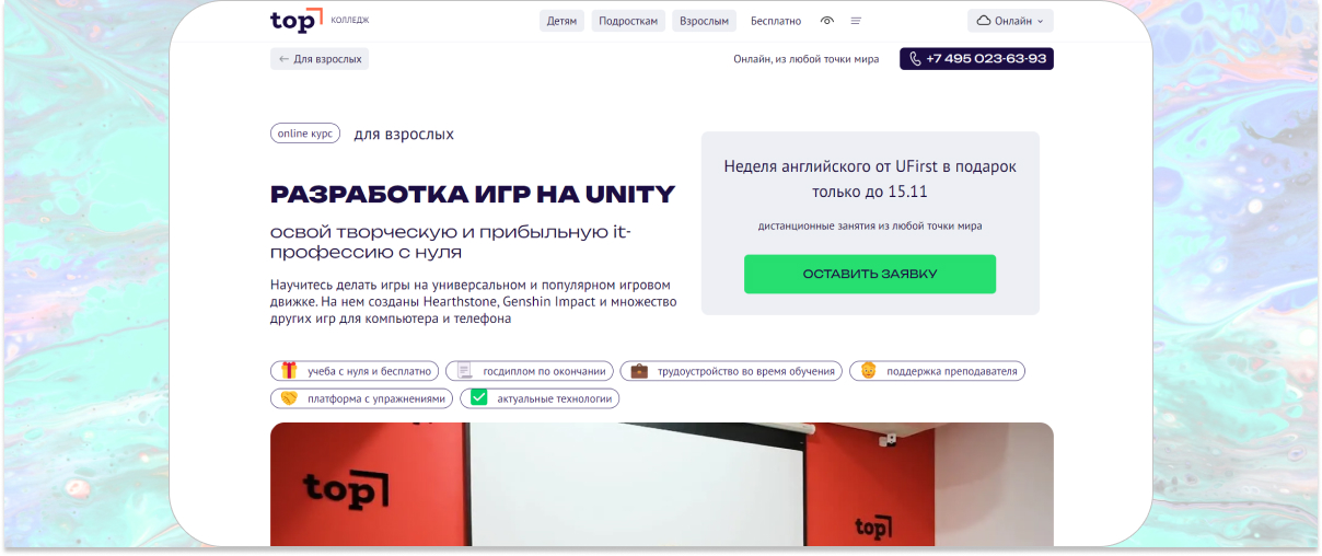 - «Разработка игр на Unity» от «Академии TOP»: бесплатное начало обучения, а помощь с трудоустройством предоставляют уже в процессе.