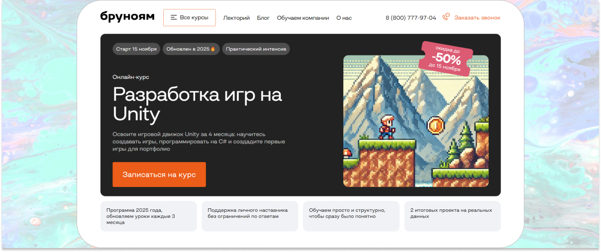 - «Разработка игр на Unity» от «Бруноям»: емкий курс с обилием практики и бонусным карьерным модулем.