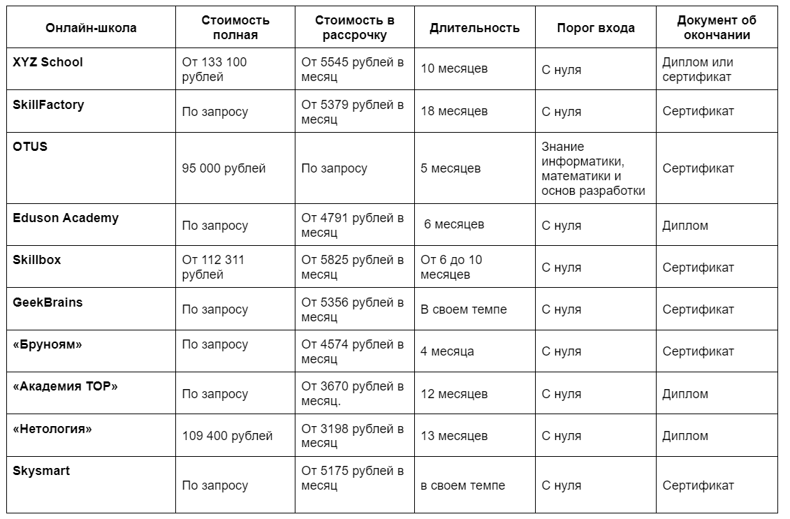 В таблице указали полную стоимость и цены в рассрочку, длительность каждого курса, порог входа и вид документа об окончании. Это позволит быстро сравнивать школы по основным критериям.