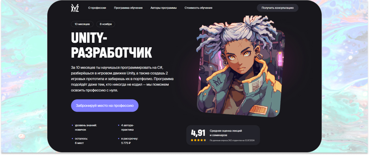 - «Профессия “Unity-разработчик”» от XYZ School: помогут с нуля освоить создание игр под руководством практикующих авторов, разработают карьерный план и подберут оптимальный формат обучения.