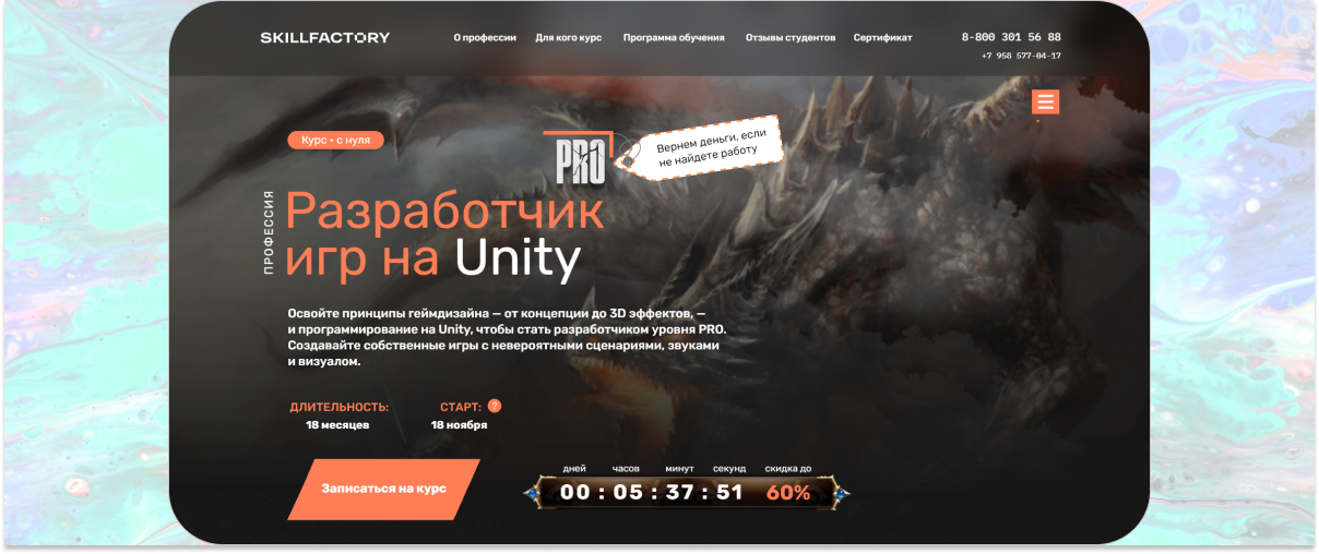 - «Профессия “Разработчик игр на Unity”» от SkillFactory: масштабный курс с возможностью попасть в кадровый резерв компании-партнера.