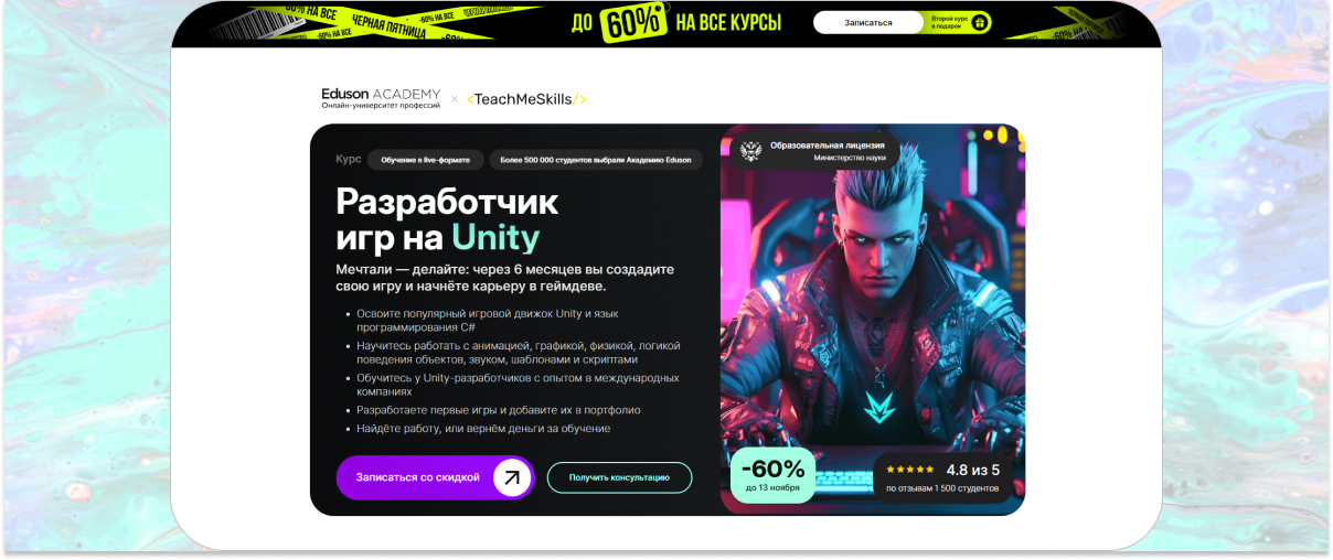- «Разработчик игр на Unit» от Eduson Academy: программа с пятью проектами в портфолио, а доступ к курсу и обновлениям остается навсегда.
