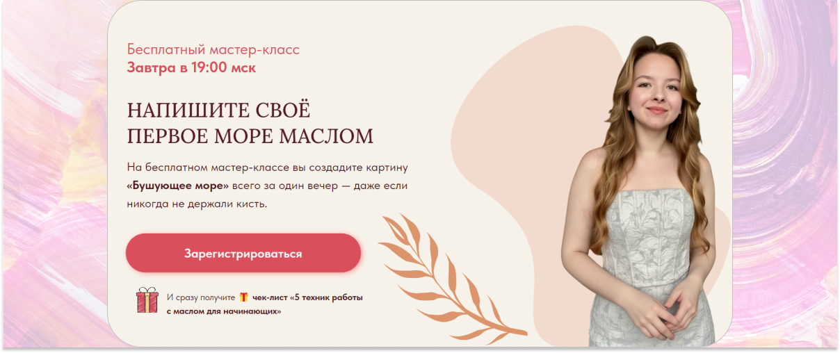 Это отдельные занятия продолжительностью от одного до трех часов, посвященные созданию одной конкретной картины. Преподаватель подробно показывает весь процесс от начала до конца: как смешивать нужные оттенки, в каком порядке наносить слои, какими кистями работать на каждом этапе. Мастер-классы могут проводиться очно, как «Нежность пионов» от House of Arts, дистанционно в записи или в формате прямого эфира с возможностью задавать вопросы.