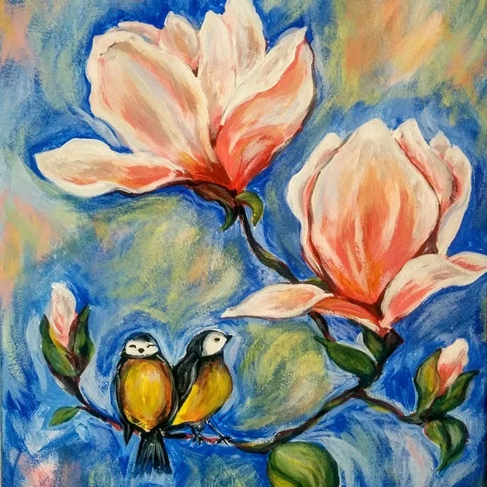 Работа учеников студии Егора Матита. Яркая картина с двумя маленькими птицами, сидящими на ветке крупного цветущего растения. Фон насыщенно‑синий с мягкими переходами в пастельные тона, что создает эффект воздуха и глубины.