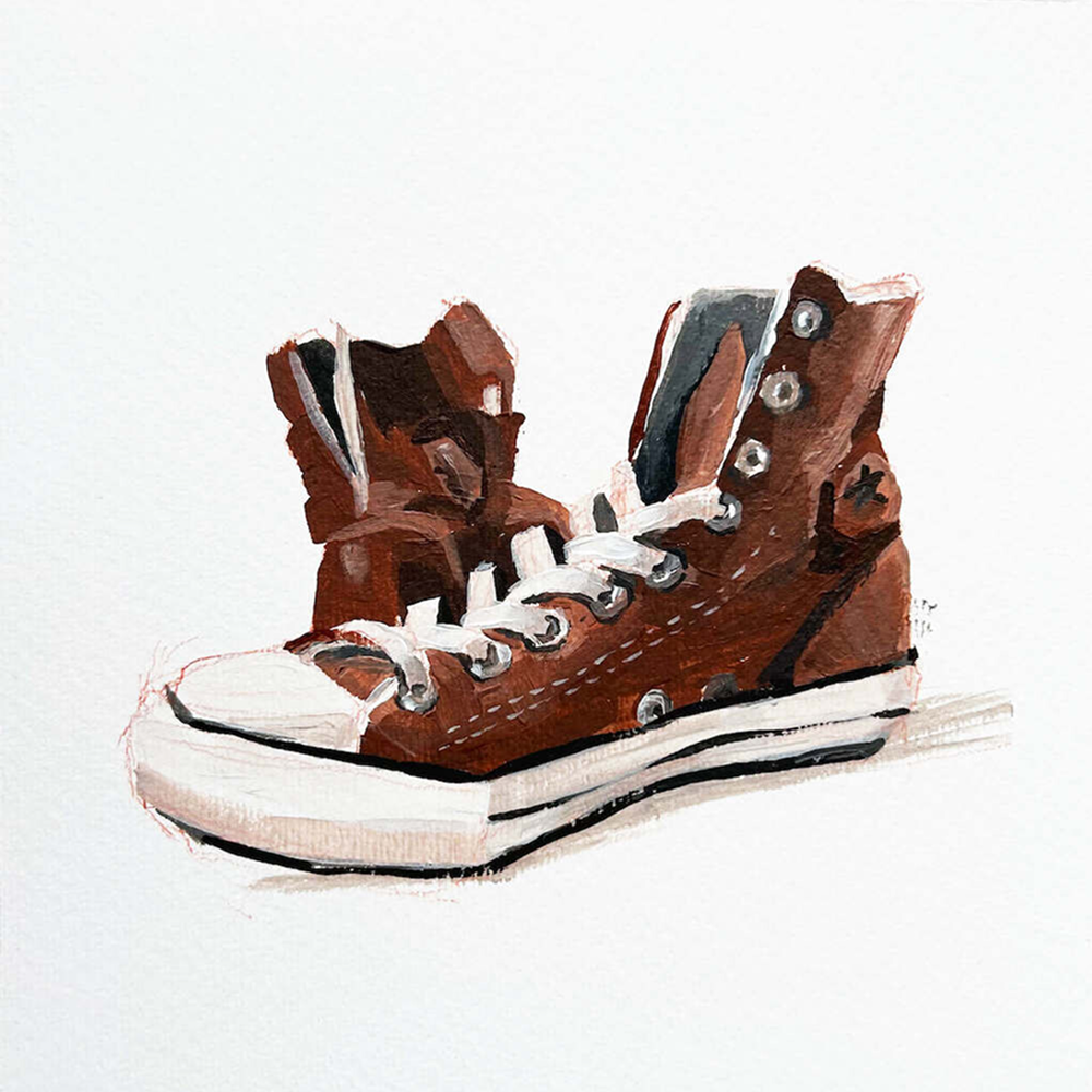 Картина учеников KalachevaSchool. Небольшая живописная зарисовка высоких кед, выполненная в акриловых красках на светлом фоне. Автор подчеркнул форму обуви широкими мазками и контрастными пятнами темно‑коричневого, охристого и белого.