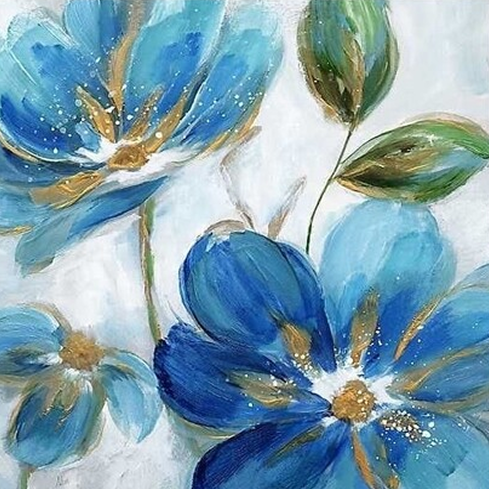 Работа учеников школы Максима Манькова. Абстрактно‑декоративная флористическая композиция с крупными синими цветами на светлом фоне. Цветы написаны широкими пластичными мазками: разные оттенки синего, бирюзового и акценты золотистого у сердцевины и на прожилках лепестков.