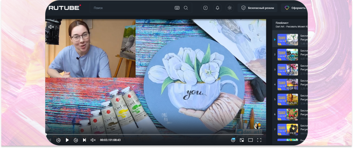 Часовой урок на Rutube. Для занятия понадобится плотная бумага, акрил, синтетические кисти, палитра, простой карандаш и ластик. Автор подробно объяснит процесс разметки композиции, расскажет, как наносить цветовые пятна, добавлять контрасты. Зрители увидят референс, получат возможность наблюдать за процессом работы автора в крупном плане.