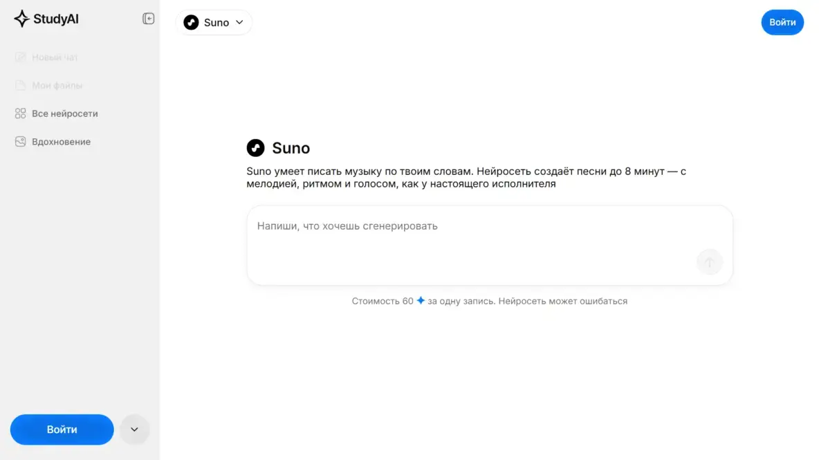 Тип сервиса: агрегатор нейросетей с генерацией музыки через Suno AI.