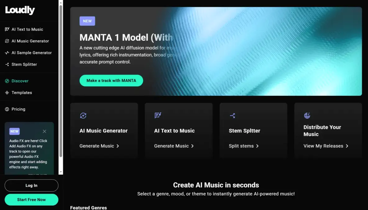 Бесплатный доступ: 1200 кредитов в месяц, 10 треков до 5 минут, публикация в общедоступной библиотеке.