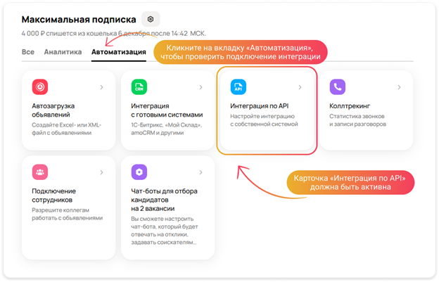 - Выберите вкладку «Автоматизация». Найдите в ней вкладку «Интеграция по API». Она должна быть активной, т.е. отображаться, как включенная. Если это не так, обновите тарифный план или обратитесь для помощи в техподдержку.