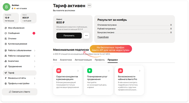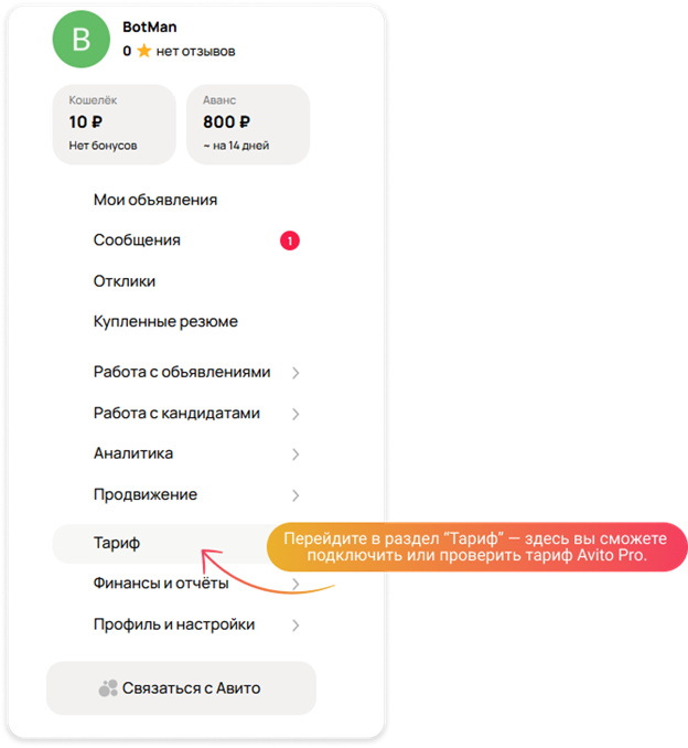 Ниже мы научимся подключать аккаунт Авито к конструктору BotMan для работы с ботами. Предварительно вам потребуется подключить на Avito тариф Pro или Unlimited для стабильной работы и доступа к расширенному функционалу.