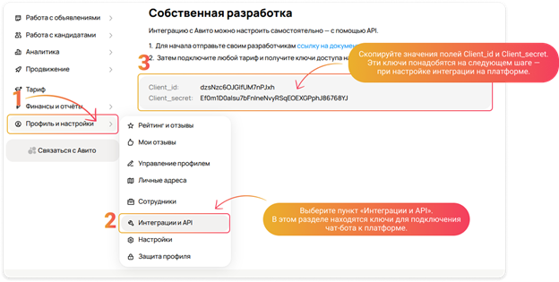 Если решить проблему самостоятельно не удалось, обратитесь в поддержку BotMan. Потребуется указать ваш Client_id и приложить скриншот из раздела «Интеграции и API» в аккаунте Авито.