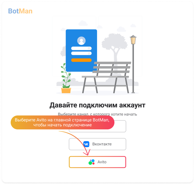 - Перейдите на главную страницу конструктора BotMan, зарегистрируйтесь. На странице подключения аккаунта выберите «Авито».