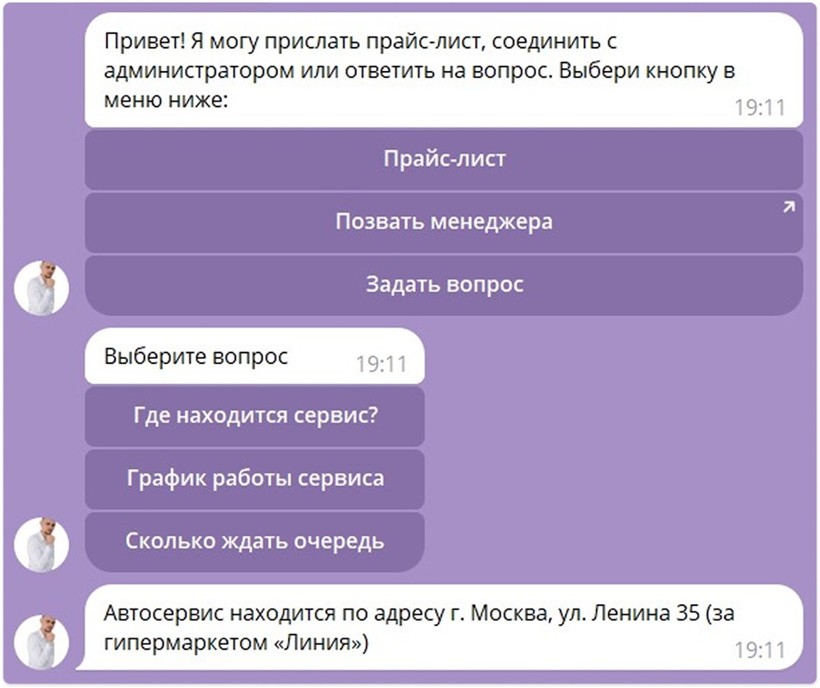 Работа с кнопками и меню. Бот оснащен удобной системой навигации с предварительно установленными пунктами меню и кнопками.