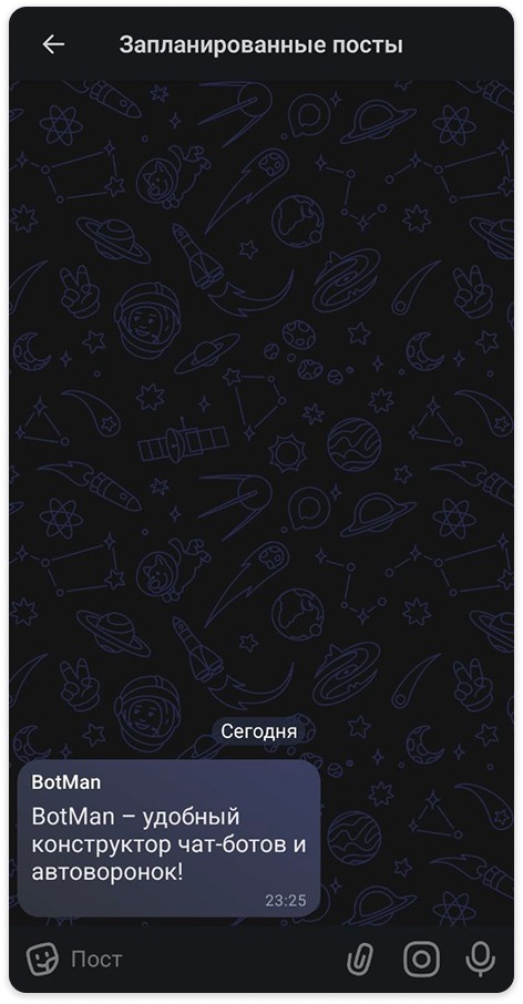 Проверка времени отправки. Для каждого сообщения отображается точная дата и время, когда оно будет опубликовано.