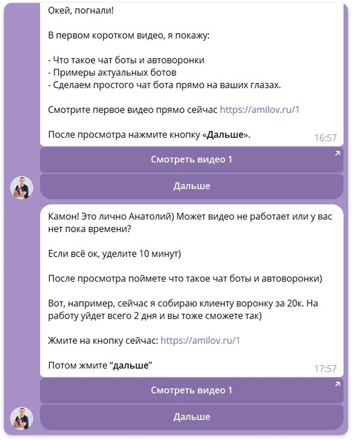 Допустим, вы хотите сопровождать клиентов после первого контакта. С помощью бота это реализуется так: