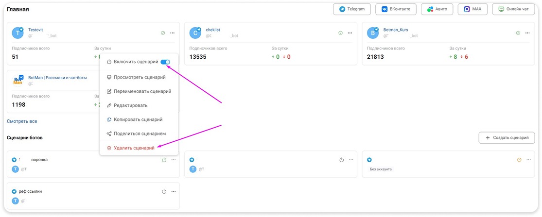 В платформе доступна не только функция удаления, но и приостановки бота с сохранением всей конфигурации для оперативного восстановления.