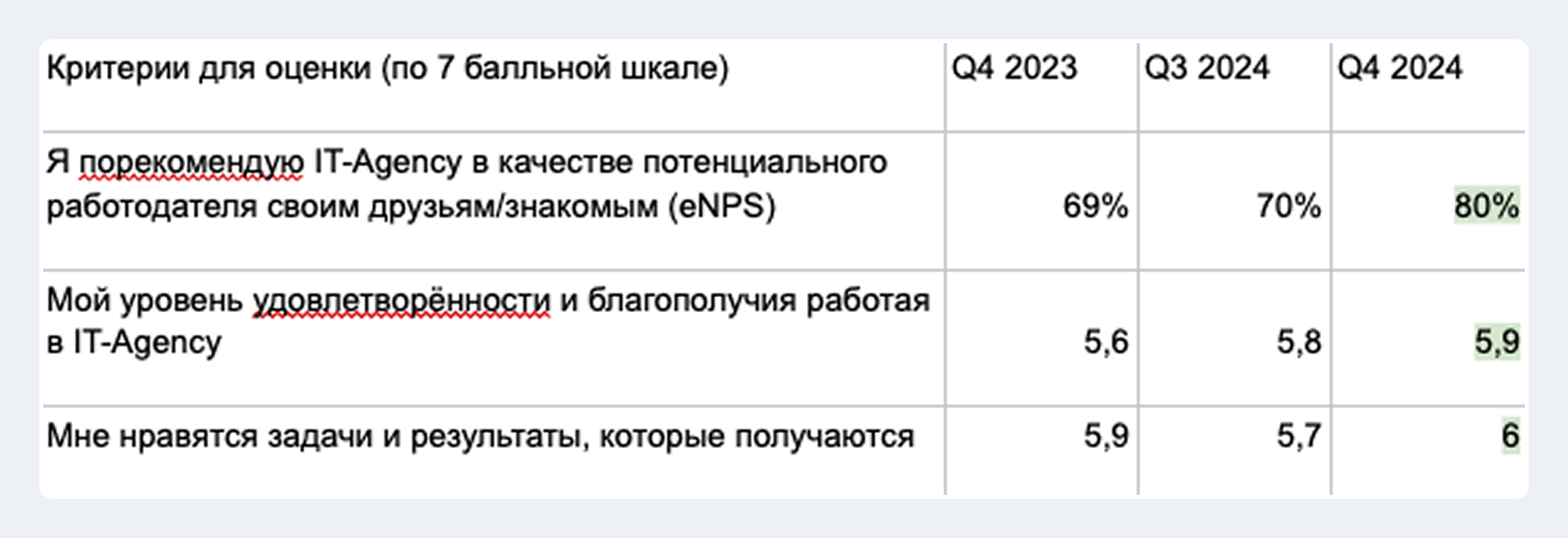 Сейчас же я смотрю на eNPS — лояльность сотрудников — и классические штуки типа среднего балла по пульсу. Я анализирую результаты опросов как квартал к кварталу, так и год к году. 2023 и 2024 годы были похожи по темпу развития и я видела закономерности и рост показателей, например по здоровью, после внедрения изменений.