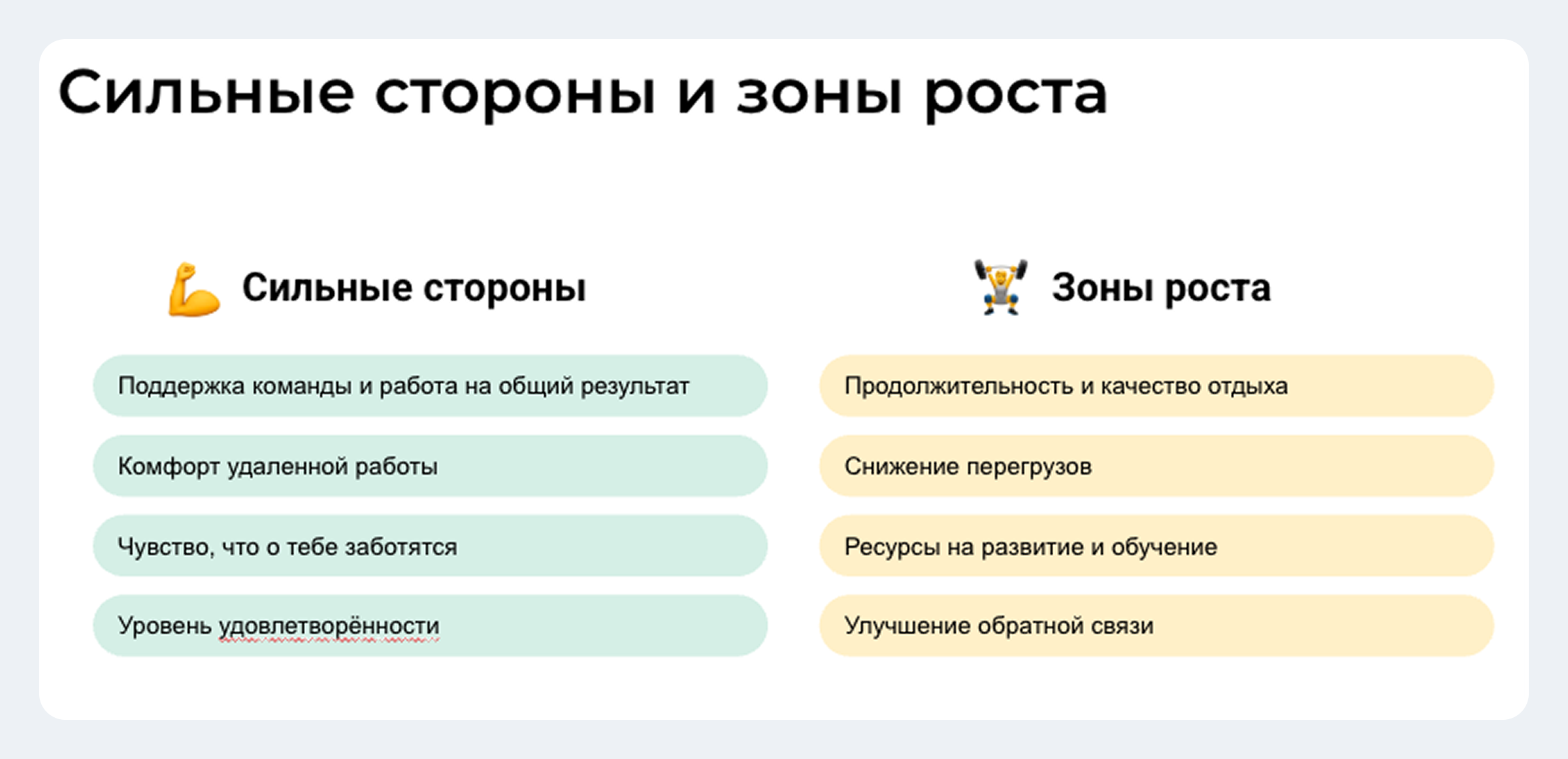 Вопросы, которые зашиты в пульс-опрос, — это ключевые смыслы, за которыми нужно следить. С помощью результатов опроса я вижу проблемные зоны и могу определить, насколько они критичные