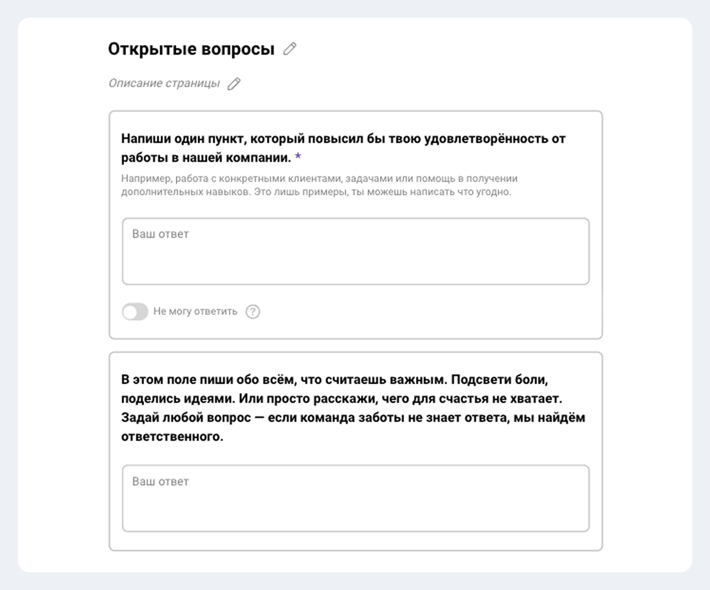 Пульс-опрос появился на базе стратегических планов и интервью с командой. Это опросник, в котором сотрудникам нужно где-то потыкать по шкалам, а где-то дать развёрнутые ответы. Я запускаю его на команду каждый квартал. Ребята могут отвечать анонимно, но, как правило, 60% команды не скрывает своё имя. Это сильно упрощает жизнь, потому что сразу понимаешь, где и как кому-то можно помочь, а не гадаешь, кто же это ответил.