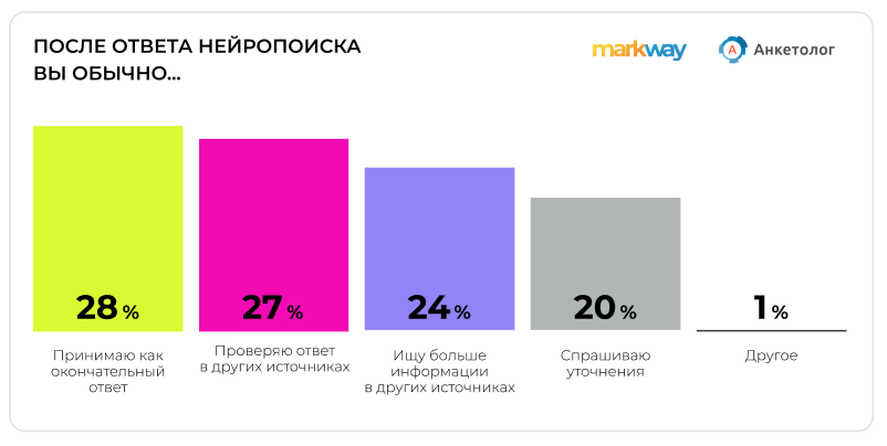 Лишь 28% готовы принять ответ нейросети как окончательный. Остальные предпочитают перепроверить: 81% обращают внимание на источники, а 27% дополнительно уточняют запрос.