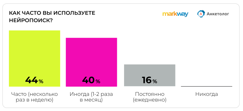 Сегодня каждый шестой пользователь обращается к нейропоиску ежедневно. 44% респондентов используют его несколько раз в неделю.