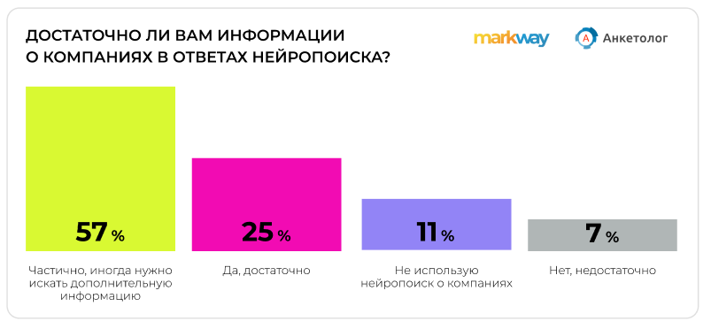 Интересно, что более половины респондентов считают ответы нейропоиска неполными. Лишь 25% довольны тем, что получают. Это значит, что бренды получили редкую возможность — управлять контентом, который ИИ подхватывает из сети, и влиять на то, как выглядит их цифровой образ.