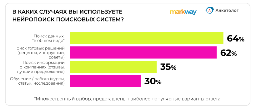 Пользователи обращаются к ИИ не только ради любопытства. Наиболее популярные сценарии уже формируют картину нового потребительского поведения: 64% ищут общую информацию — от новостей до объяснений сложных тем. Чуть меньше — рецепты, инструкции и советы. Каждый третий изучает информацию о компаниях, ценах, отзывах и репутации, используют для учёбы и профессионального развития.