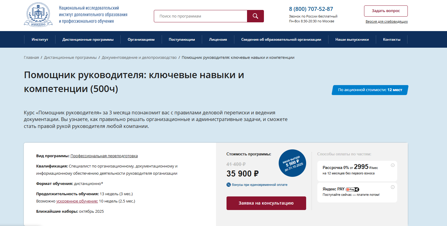 ⭐Персональный ассистент руководителя от НИИДПО — программа на 500 часов с получением диплома о профпереподготовке и скидками до 70%.