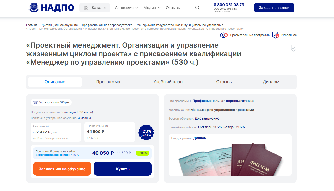 Проектный менеджмент: организация и управление от НАДПО — профессиональная переподготовка с присвоением квалификации менеджера проектов и дипломом государственного образца.