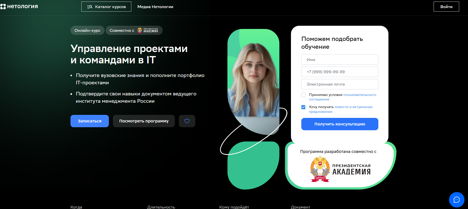 Менеджер проектов в IT от Нетология × РАНХиГС — программа подготовки IT-менеджеров с дипломом государственного университета РАНХиГС и фокусом на управление технологическими проектами.