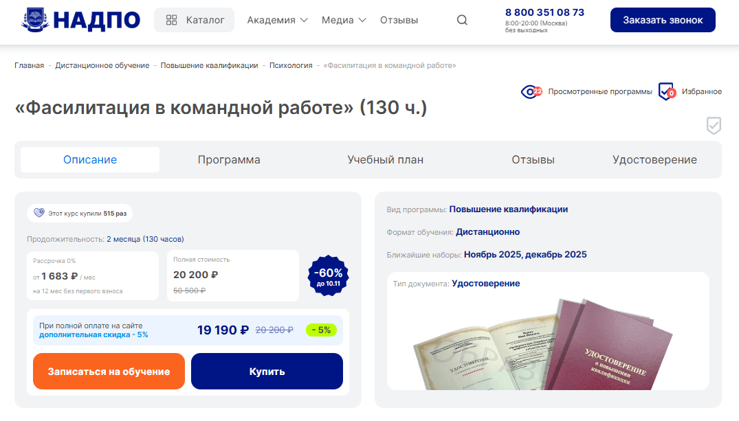 Фасилитация в командной работе от НАДПО — дистанционная программа повышения квалификации на 130 часов с государственным дипломом и беспроцентной рассрочкой.