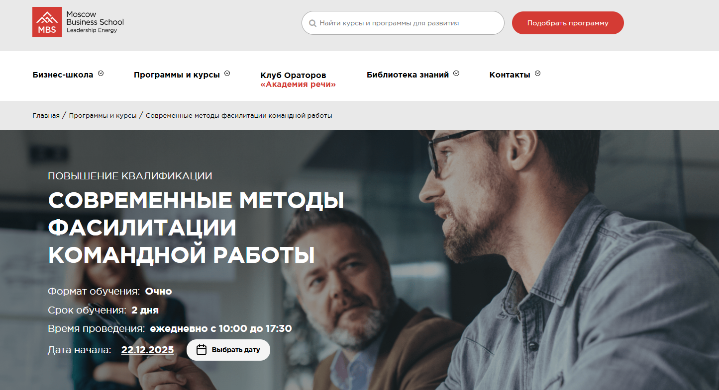 Практикум: Управление групповыми встречами и решение командных задач от Moscow Business Academy — двухдневный интенсив с отработкой техник фасилитации на реальных кейсах участников и практикой модерации в малых группах.