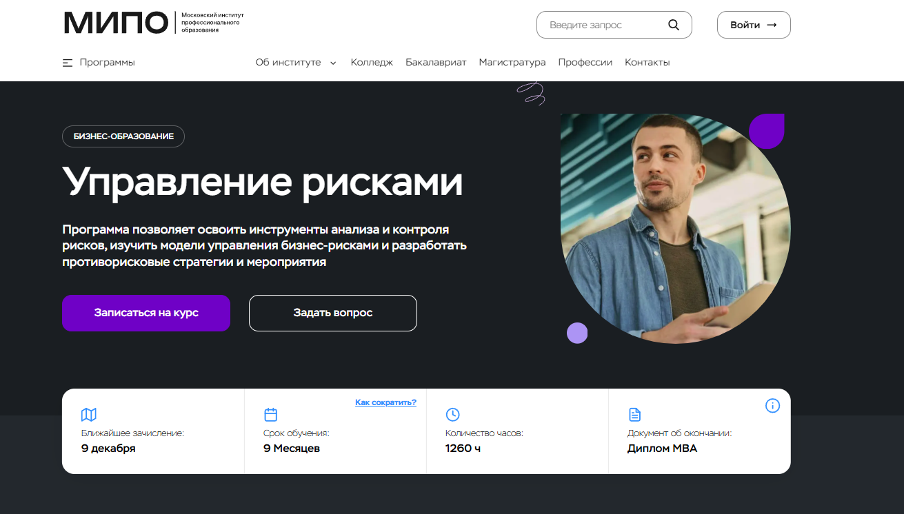 Программа Mini MBA Московского института профессионального образования позволяет освоить инструменты анализа и контроля рисков за 9 месяцев дистанционного обучения. Курс подойдет владельцам малого и среднего бизнеса, менеджерам проектов и создателям новых проектов, которые стремятся научиться управлять организацией на разных стадиях развития. Обучение охватывает модели управления бизнес-рисками и разработку противорисковых стратегий для защиты компании от финансовых угроз.